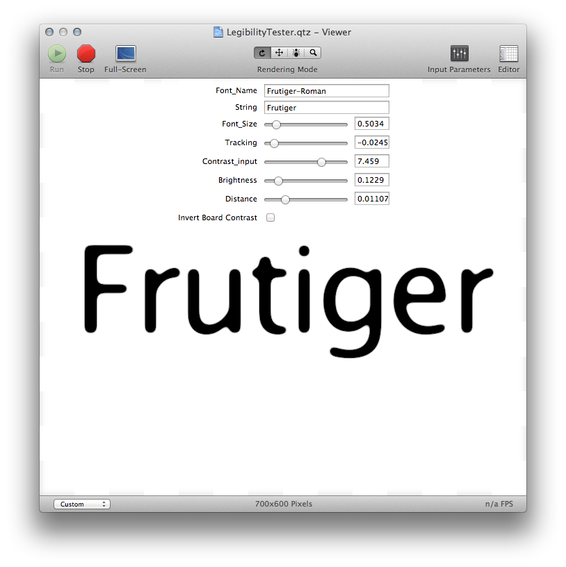 A type legibility tester made with Quartz Composer. Modelled on the Legibility Tool of Ralf Herrmann