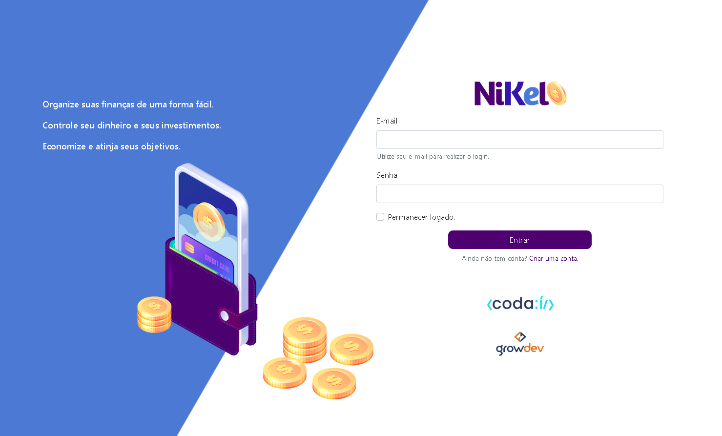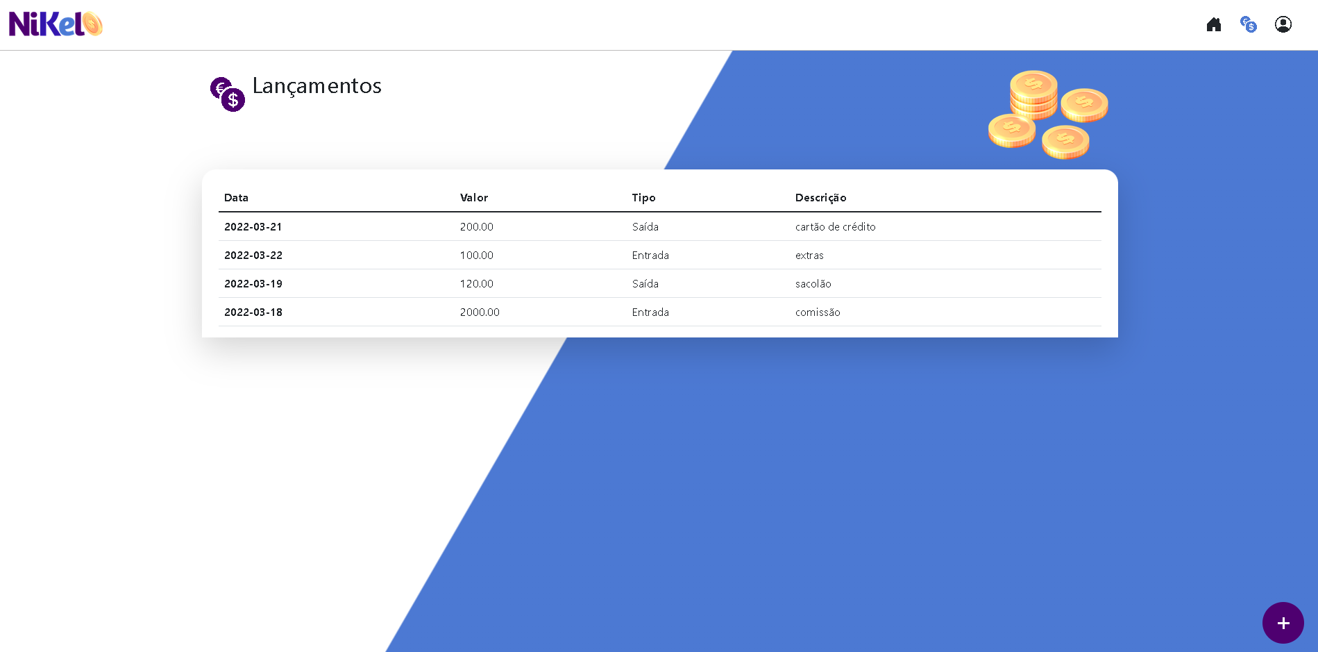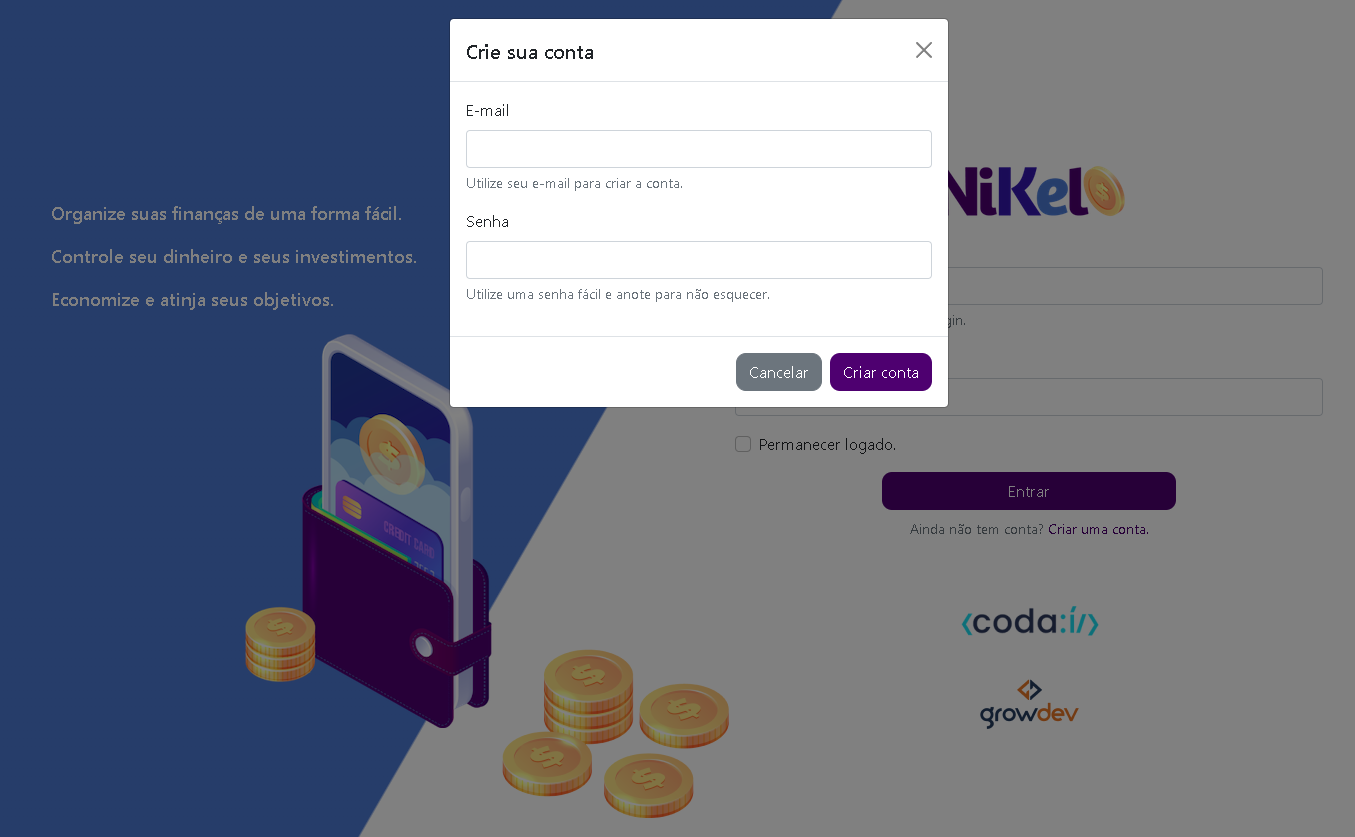 nikel Criação de uma aplicação web para lançamento de entradas e saídas financeiras. Teste você mesmo: https://365rafael.github.io/nikel/ #Tela de Login: #Modal de criação do login: #Tela de lançamentos: #Tela de listagem de todos os lançamentos: