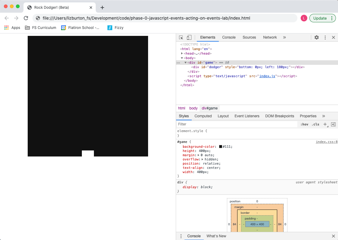 dodger.style.left = "0px";You should see the dodger nestled up against the bottom left corner of the game field.