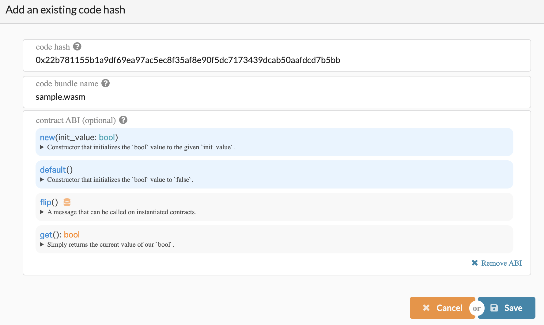Go back to the Upload WASM modal. Next, upload the “sample.wasm” to compiled contract WASM panel, and “metadata.json” to contract ABI panel. Once finished, the following parameter will be displayed.