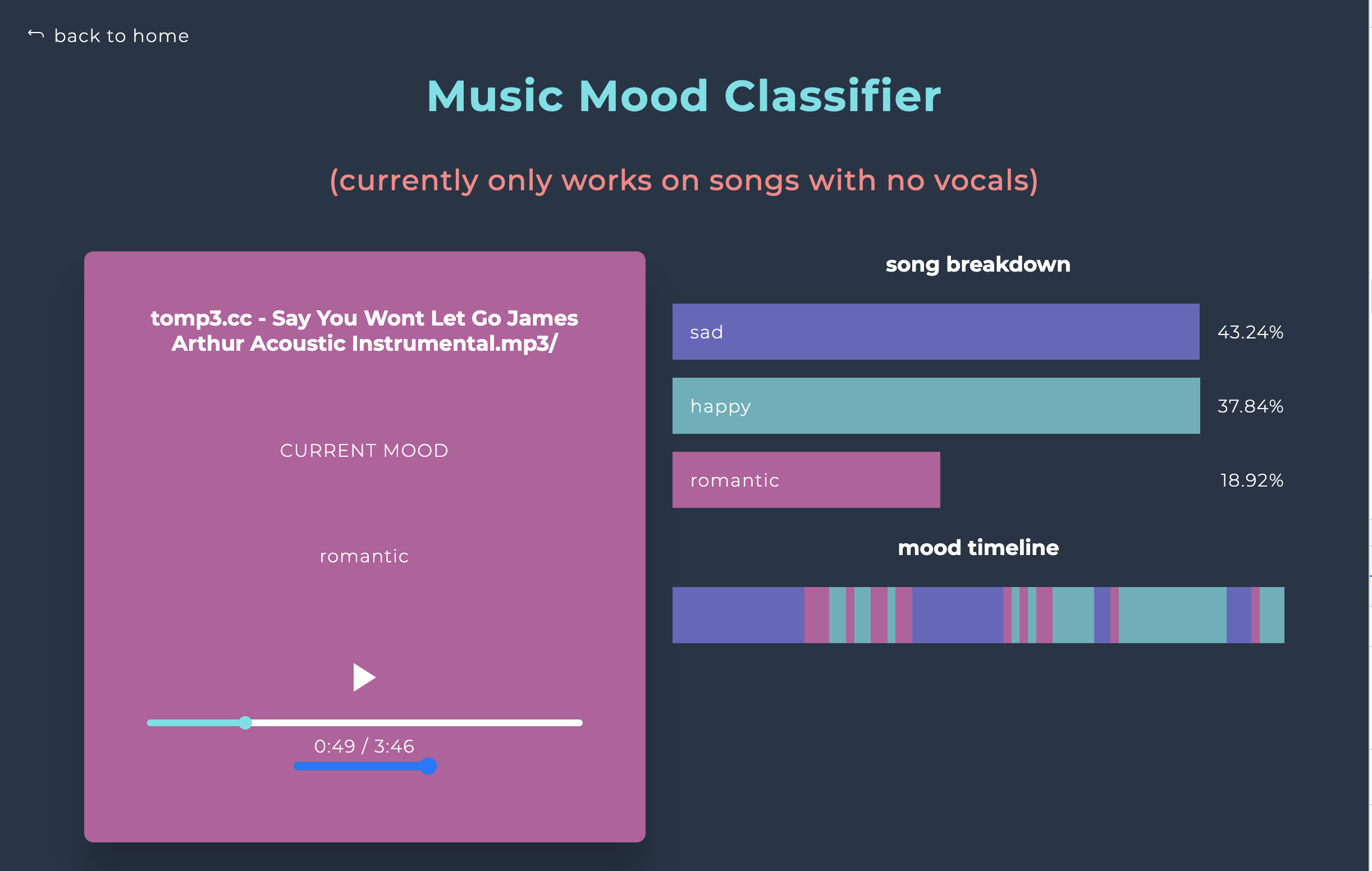 My first Machine Learning project which taught me a little about DSP and MIR on the side. Try it out here at moodify.austinshih.com