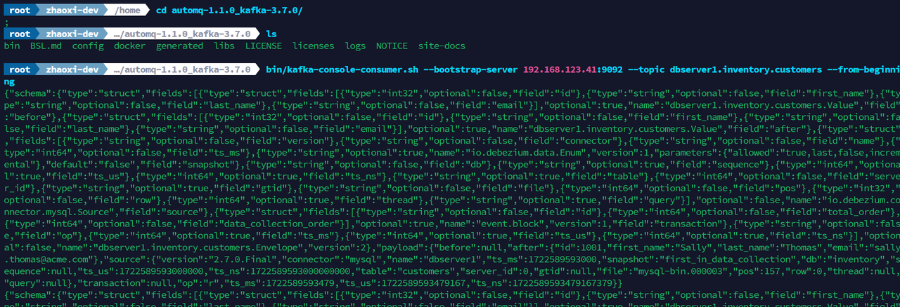 bin/kafka-console-consumer.sh --bootstrap-server 192.168.123.41:9092 --topic dbserver1.inventory.customers --from-beginning