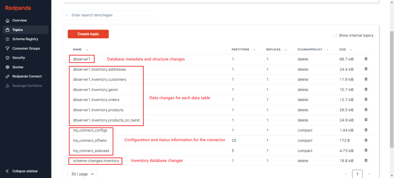 You can see that all database tables monitored by the connector are displayed, along with the connector's configuration files, offsets, and each table corresponds to a Topic.