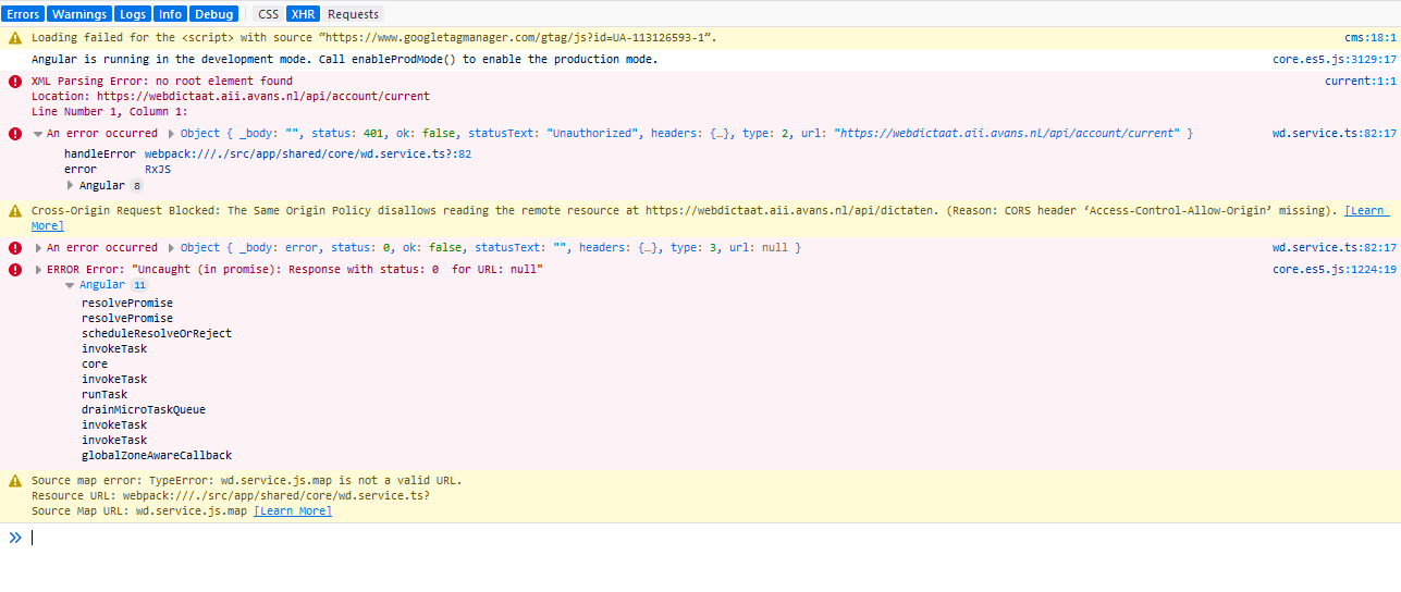 Wanneer een gebruiker niet is ingelogd en hij of zij bezoekt de homepage, blijft de applicatie eeuwig laden en staan de volgende errors in de javascript console;