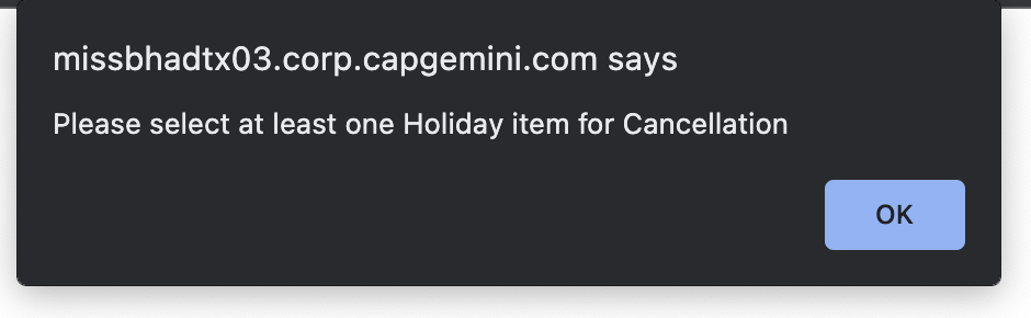 This image above shows when selecting a record in the 'my holidays' tab and clicking cancel holidays it doesn't recognise a selection and I get this error below.