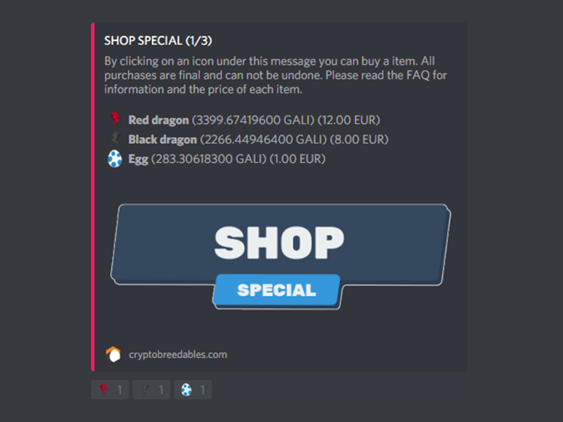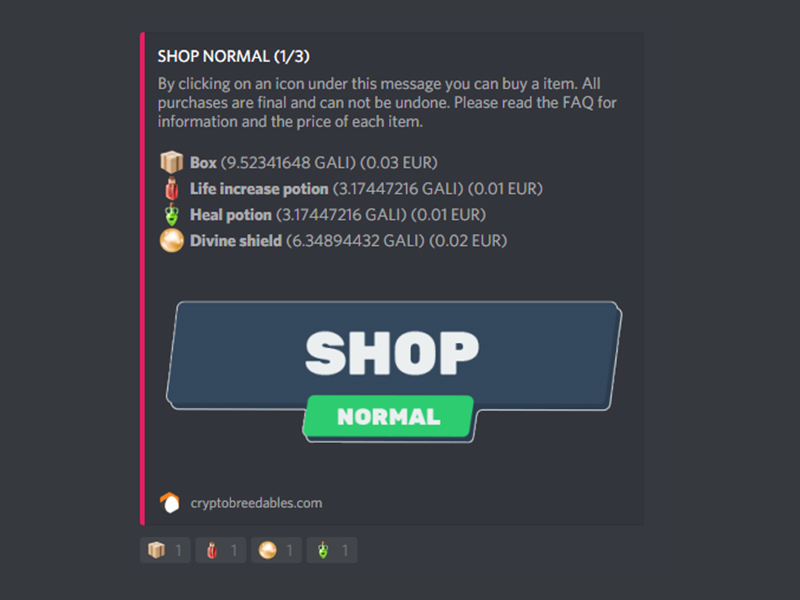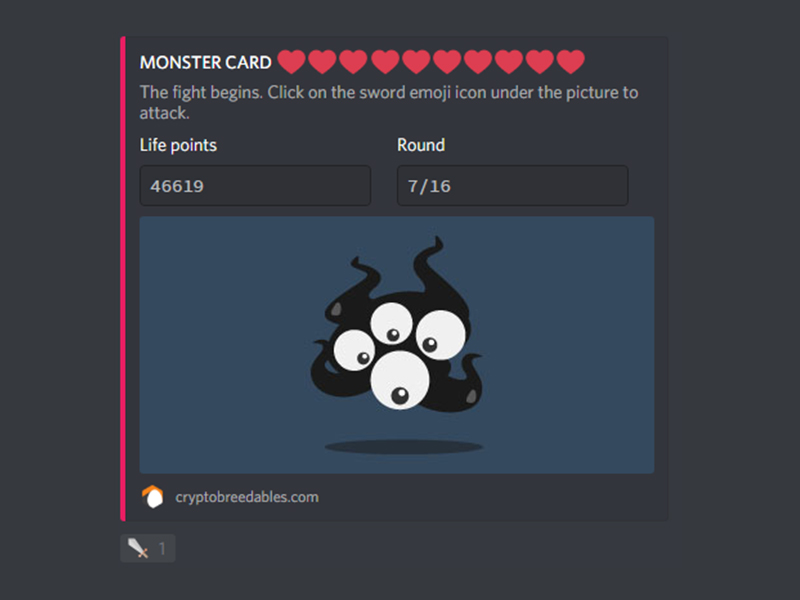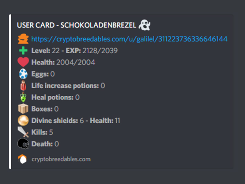 Cryptobreedables is a text and image based driven Discord game. Its as easy as it sounds. All actions can be done by reacting to the bot messages by clicking the emoji icons given on the events. You can fight, level up, collect nice items and earn free crypto coins.