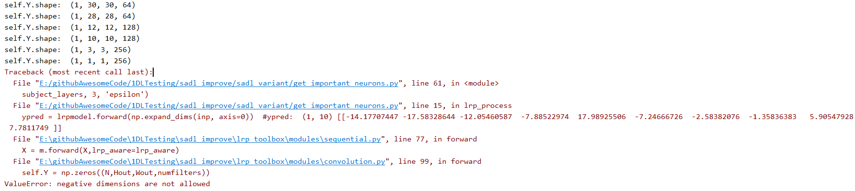 I trained a model namely 'cifar10-vgg16_model' on the CIFAR10 dataset. When I run the code to find the relevance score of each neuron, I got the following error message.