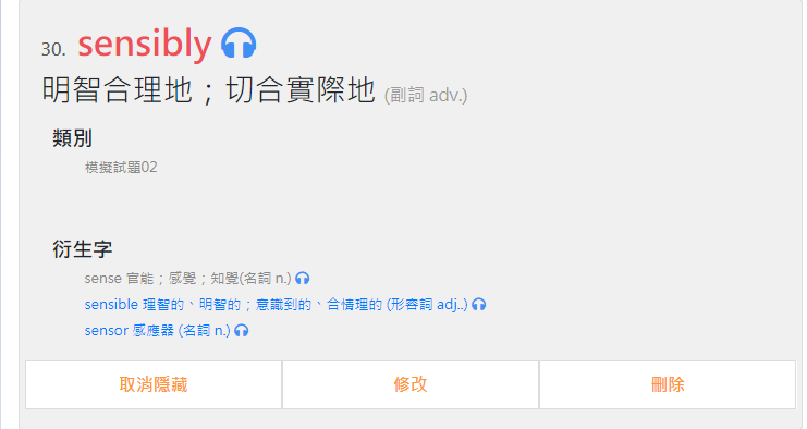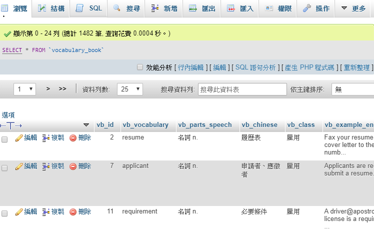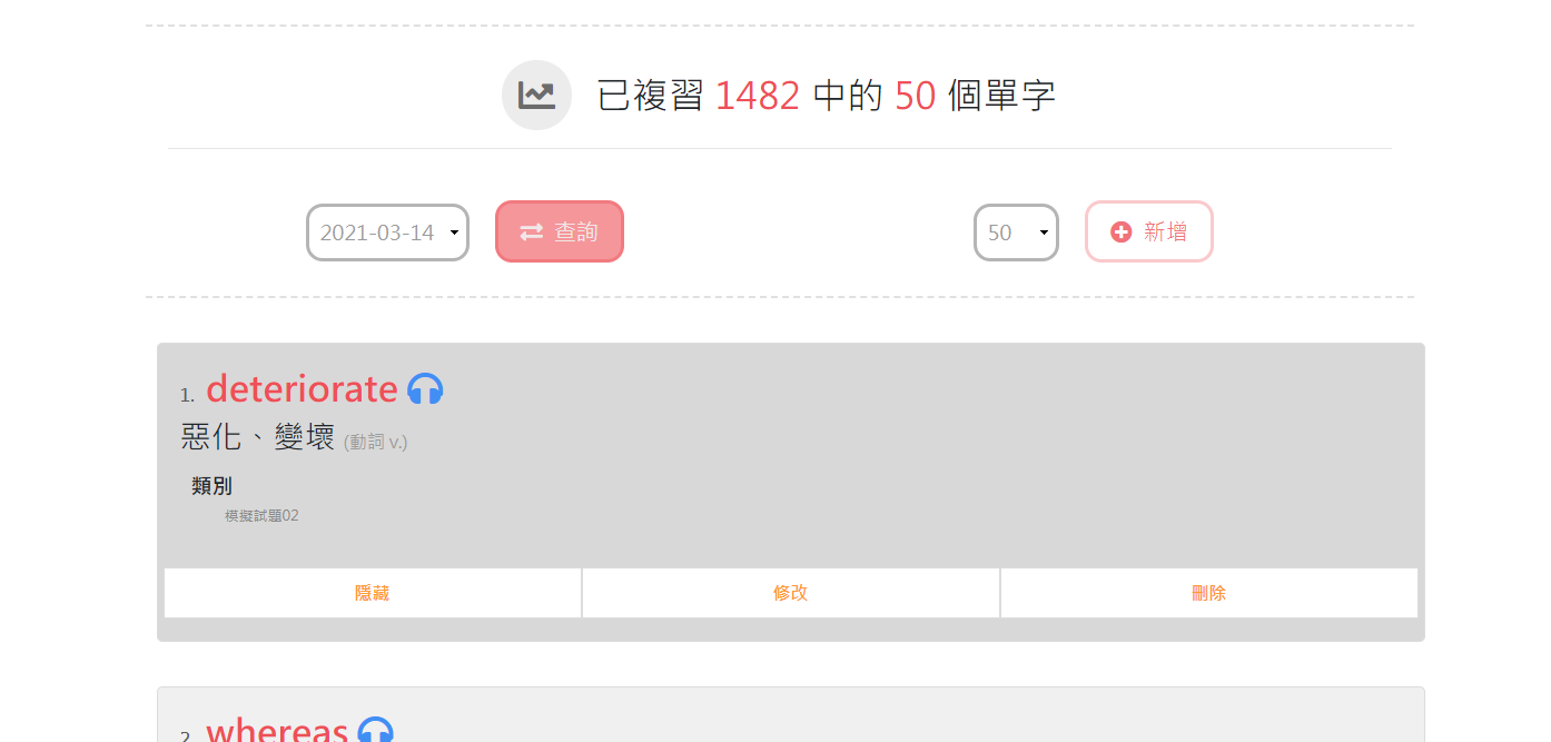 單字測驗系統 - VocabularyTest 提供單字書+測驗的功能 可錯誤題目「自動重複」出題、正確題目不重複出題 自動連結正確發音檔案 一、應用技術 HTML JS CSS PHP MySQL 二、特色功能 自動抓取發音 重複文字「自動」連結與管理 隨機測驗功能 三、系統說明 現在的單字卡程式功能千奇百怪,但就是沒有能把我需要的功能整合的,只能自己建一個了: 自訂單字卡內容、類別 自動尋找、連結發音 自動尋找單字書內重複字彙,並繫結 四、功能截圖 網頁首頁 (類別總覽) 單字卡 (顯示與隱藏、發音、修改、查詢) 自動連結相關單字 隨機測驗(每日不同題目、錯誤題目自動重複出題) MySQL資料表