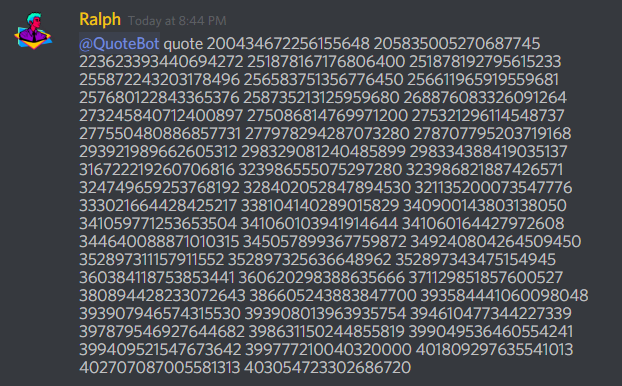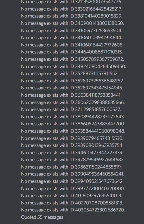 Discovered during testing for the v1.0 release. When you misquote a bunch of messages, as so:  QuoteBot spits out the following:  This bug is a twofer: 1. [ ] Condense `No message exists with ID x` error message. 2. [ ] Figure out why the `continue` on [line 82 in quote.py](https://github.com/RalphORama/QuoteBot/blob/master/cogs/quote.py#L82) doesn't actually `continue`.