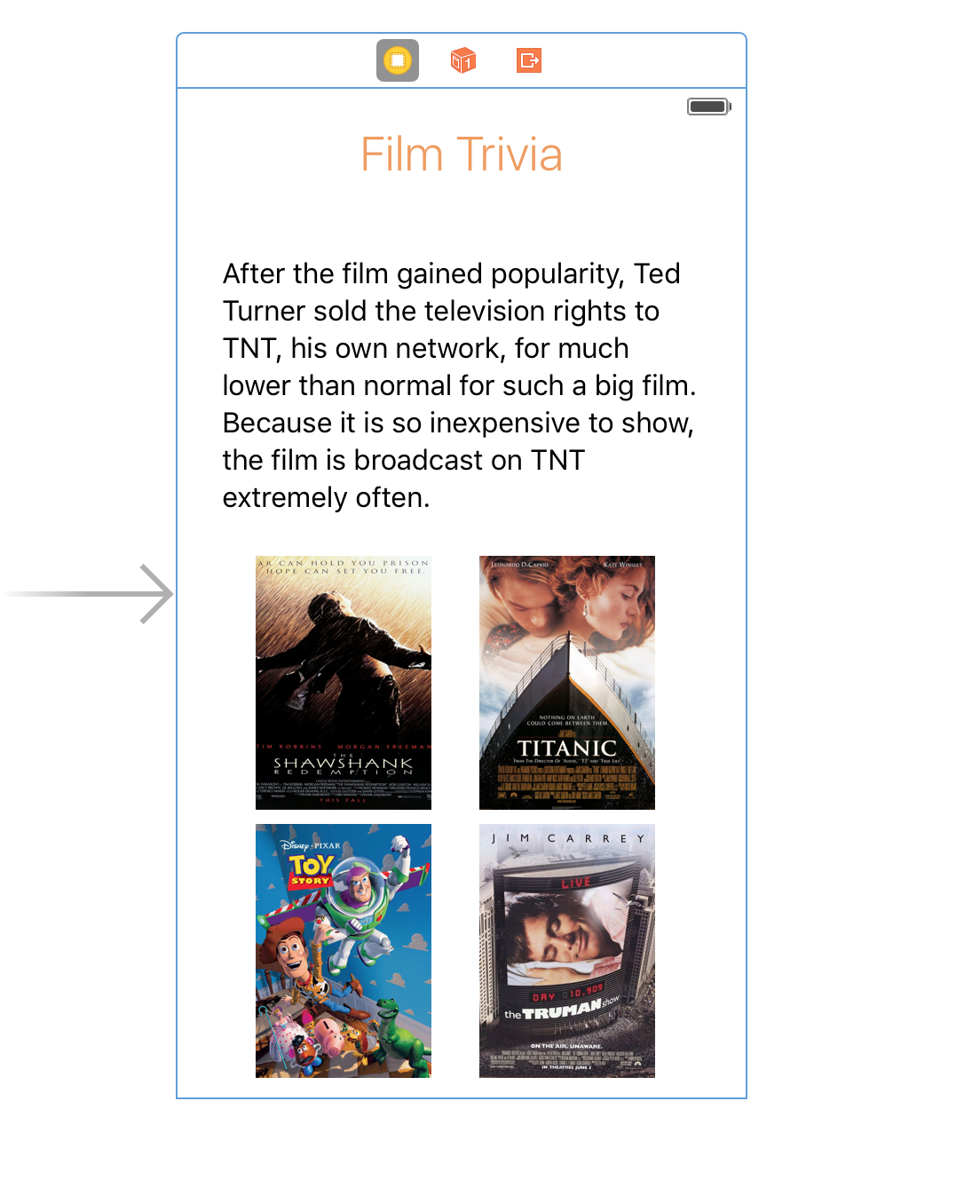 First, take a look at the Main.storyboard file. It has a pretty simple interface consisting of four movie poster thumbnails and a piece of film trivia.