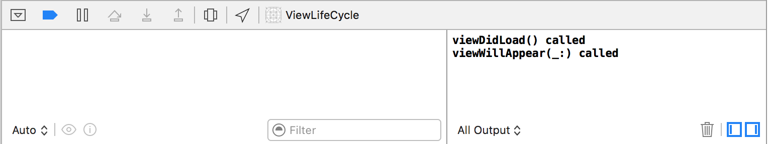 }Now, build and run your app in the simulator. You'll see the debugger output pane pop open at the bottom of Xcode's editor. Notice that right before the view appears, you'll see the message "viewDidLoad() called" logged to the console.