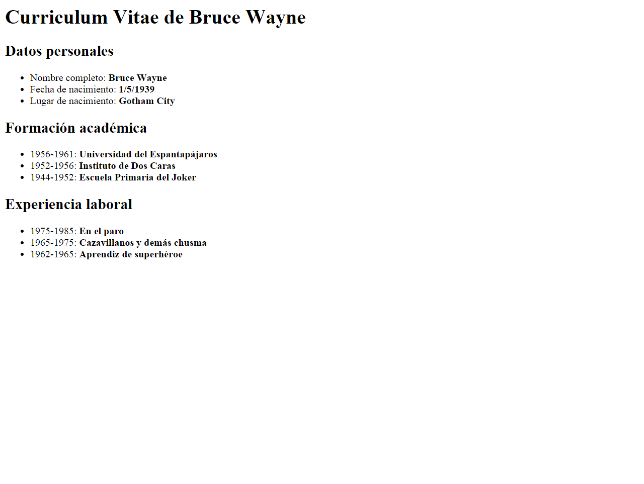 - El título de la página debe ser Curriculum Vitae de Bruce Wayne.