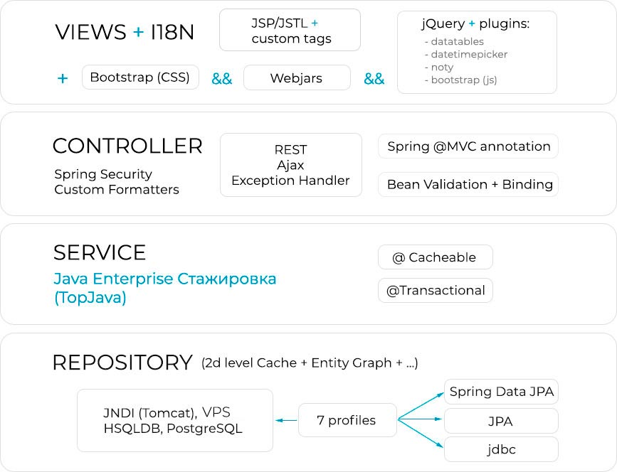Разработка полнофункционального Spring/JPA Enterprise приложения c авторизацией и правами доступа на основе ролей с использованием наиболее популярных инструментов и технологий Java: Maven, Spring MVC, Security, JPA(Hibernate), REST(Jackson), Bootstrap (css,js), DataTables, jQuery + plugins, Java 8 Stream and Time API и хранением в базах данных Postgresql и HSQLDB.