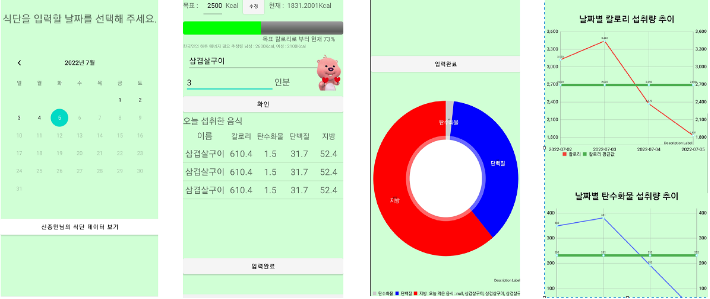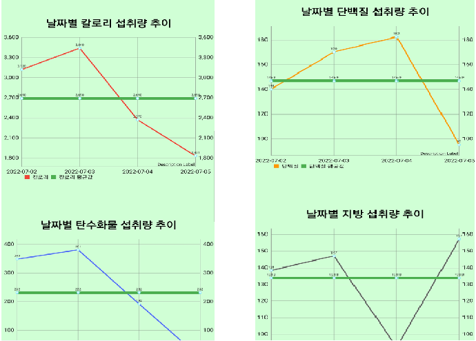 - 날짜 별로 다른 식단을 비교하고 평소 식단의 단단지 비율, 각 영양소의 추이를 알 수 있습니다.