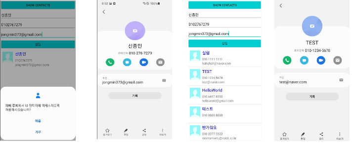 - Show contacts 버튼을 누르면 안드로이드 내에 있는 연락처의 정보를 불러와 listview로 보여줍니다.