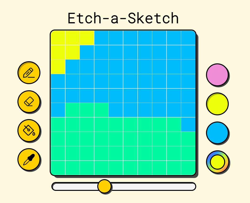 Etch-a-Sketch A simple online gridded drawing canvas with adjustable grid size. Basic tools are built in such as Pencil, Eraser and Paint Bucket tool. Quick Start Check out the canvas here! Tools Used HTML CSS JavaScript