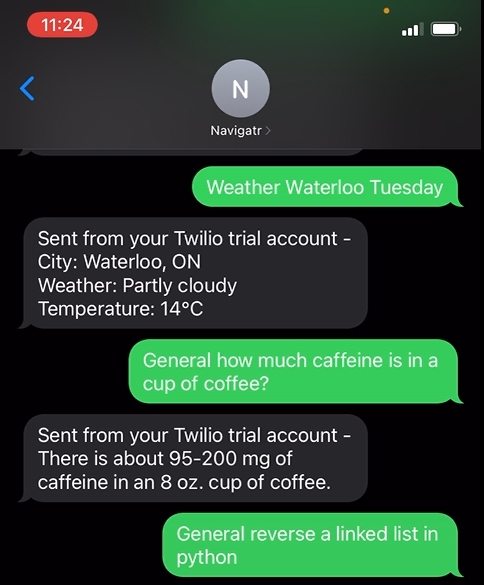 NAVIGATR uses machine learning and scrapes real-time data to respond to any inquiry you might have when data isn't available to you. We have kept in mind that the main issues that people may have when on the go and running out of mobile data are travel times, bus routes, destination information, and weather information. So, NAVIGATR is able to pull all this information together to allow users to use their phone to the fullest even if they do not have access to mobile data; additionally, we are able to allow users to have peace of mind when on the go - they will always have the information they need to get home safely.