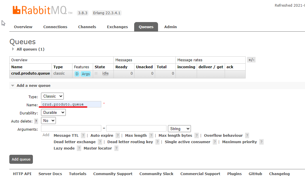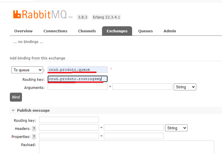 queue = crud.produto.queue Routing key = crud.produto.routingkey