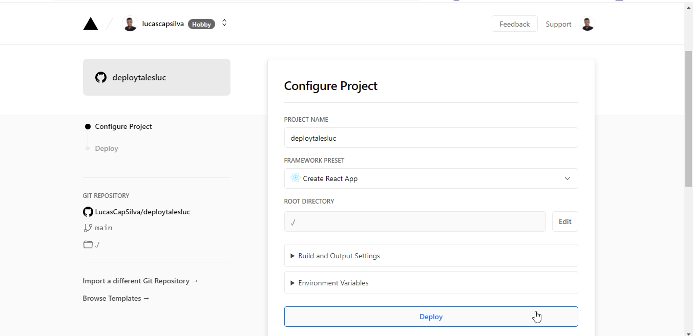 Clique no botão deploy e espere a vercel realizar o deploy.