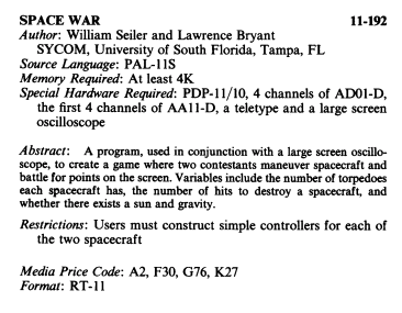 In case you just want to run the binary and not want the fun of building it from scratch, just grab the SPACEWAR.ABS file in the ar11-patch branch (if you have a AR11 board in your machine) and run in from 025424 025432 (please note that this may change since a new build of the code might affect the entrypoint, check the SPACEWAR.MAP file when in doubt). Make sure to also load the IOX binary in the IOX-11 subfolder into memory before starting the SPACEWAR and set the switch regsiter to all zeroes. I have seen that otherwise it gets stuck in the IOX library. Probably a non-zero SR indicate some options to the IOX library, but I haven't investigated that further.