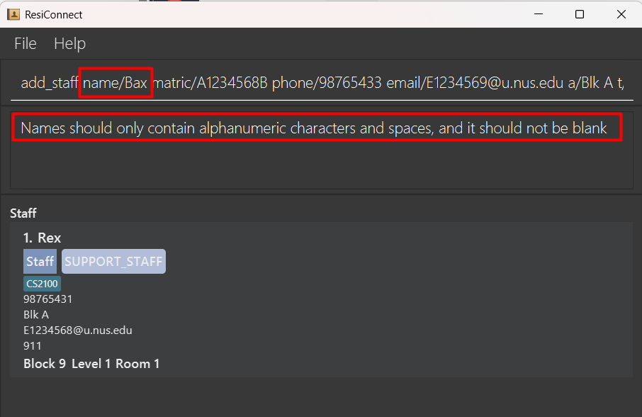 When entering the add comment for staff using the add student command, the output throws a misleading error. In the screenshot, the name I've added contain alphanumeric characters and spaces, and it is not blank, yet it denies me from entering.