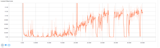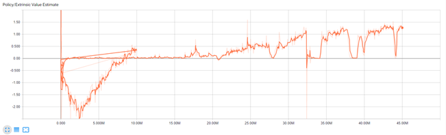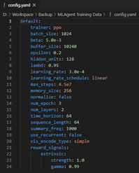 § Learning Rate Schedule: this value corresponds to how the learning rate is changed over time. For PPO, the recommended learning rate is usually set to linear in order to make it decay until Max Steps is reached, so that learning converges in a more stable way. Since it wasn't possible to infer how much training time would've been required, a decision was made to set the rate to constant instead, until a plateau was reached in the gradient descent. Once this condition was met, the training was paused, and the variable was set back to linear before continuing for the last steps.