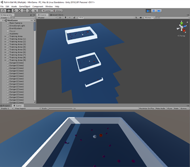 Using multiple test environments together is an incredibly efficient way of scaling things up: multiple instances can be initialised together, while sharing the same brain. The only object that needs to be unique is the Academy, the core of the entire learning process.