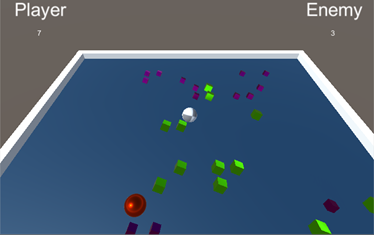A heavily trained Agent can also offer more challenging matches, as it can learn tricks to exploit environments and is also useful to spot bugs and design errors in the game. As a matter of fact, a trick that the agent learned to exploit in Roll-A-Ball is putting itself on the trajectory of a losing enemy, to be pushed in the direction of Collectible items.