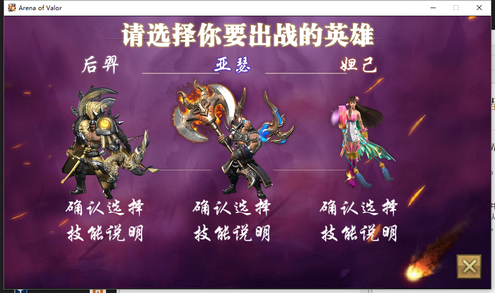 - 您可以在三个英雄中选择一个开始你的对战(建议第一次进入的玩家点击英雄下方所对应的技能说明查看技能的说明)