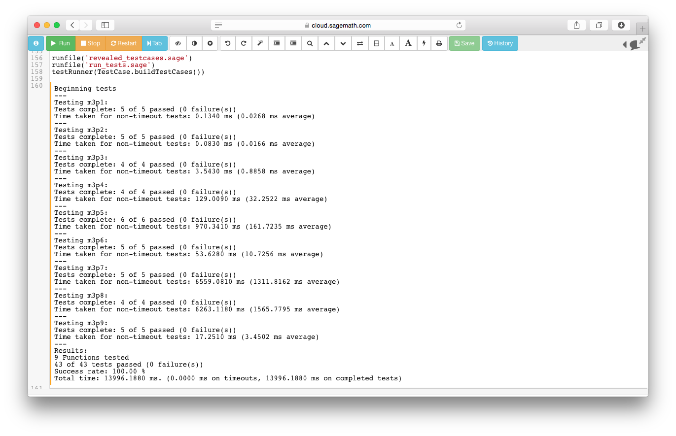 runfile('revealed_testcases.sage') runfile('run_tests.sage') testcases = TestCase.buildTestCases()Followed by:
