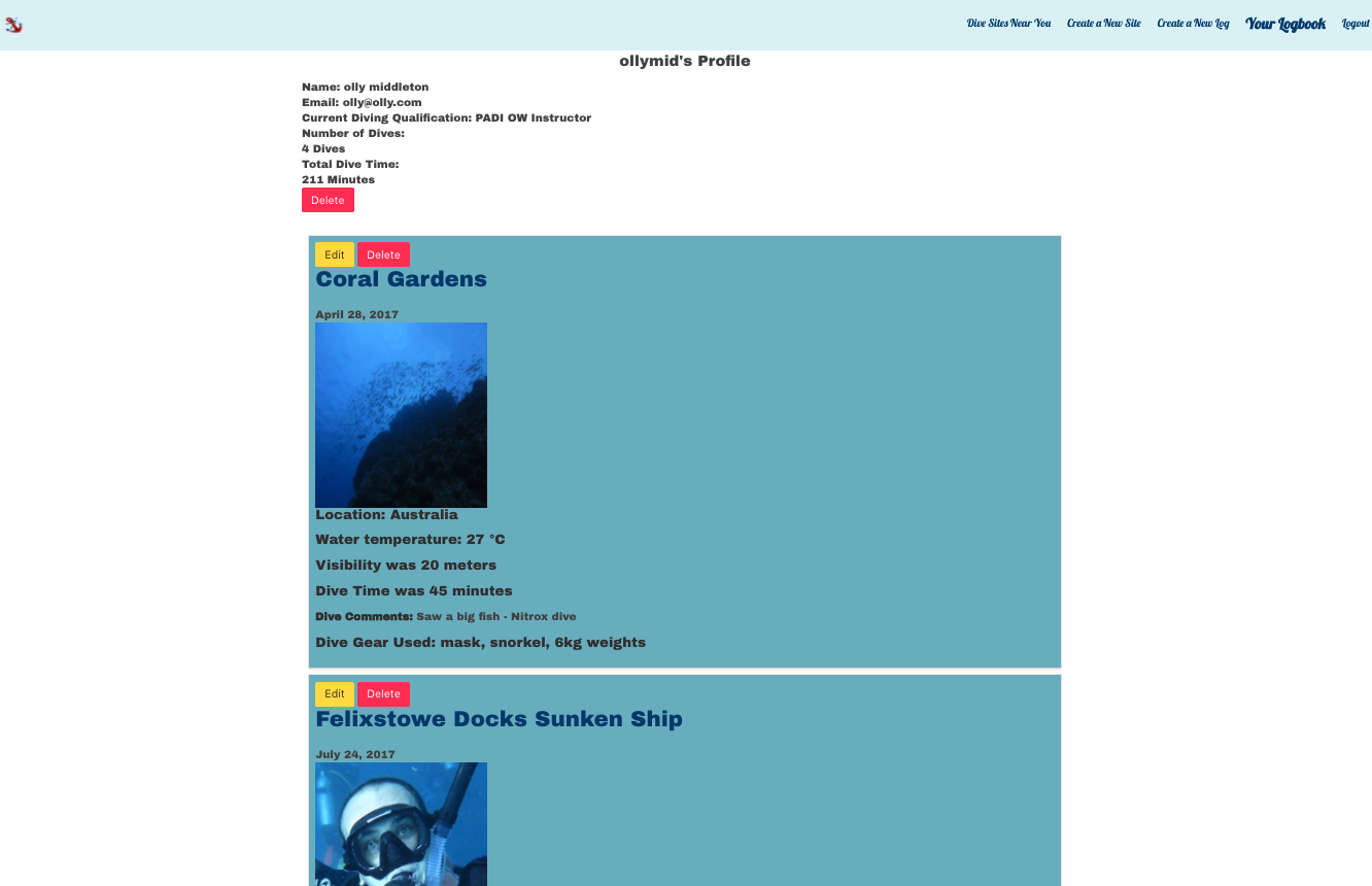 The inspiration and overall aim for this project was to create an application to replace paper logbooks in the diving industry; an industry that is long overdue a tech overhaul The purpose of this app is to allow users to log their dives digitally so they no longer have to worry about losing or damaging their paper book. Users can also add dive sites and share them so others can dive them too.