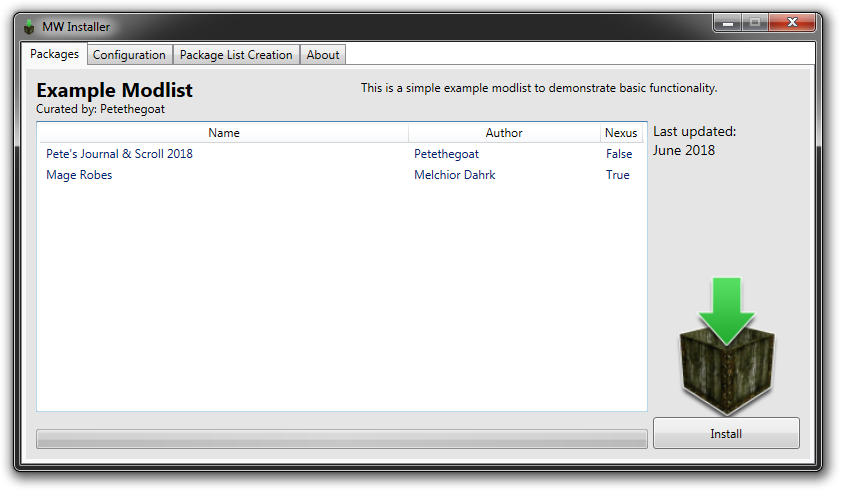 MWInstaller Packing/installation for Morrowind mods. See an example package list at https://github.com/Petethegoat/ExampleModlist. Find more instructions on the wiki.