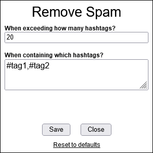 Remove tweets containing specific hashtags or tweets that exceed the maximum hashtag limit (default maximum is 20).