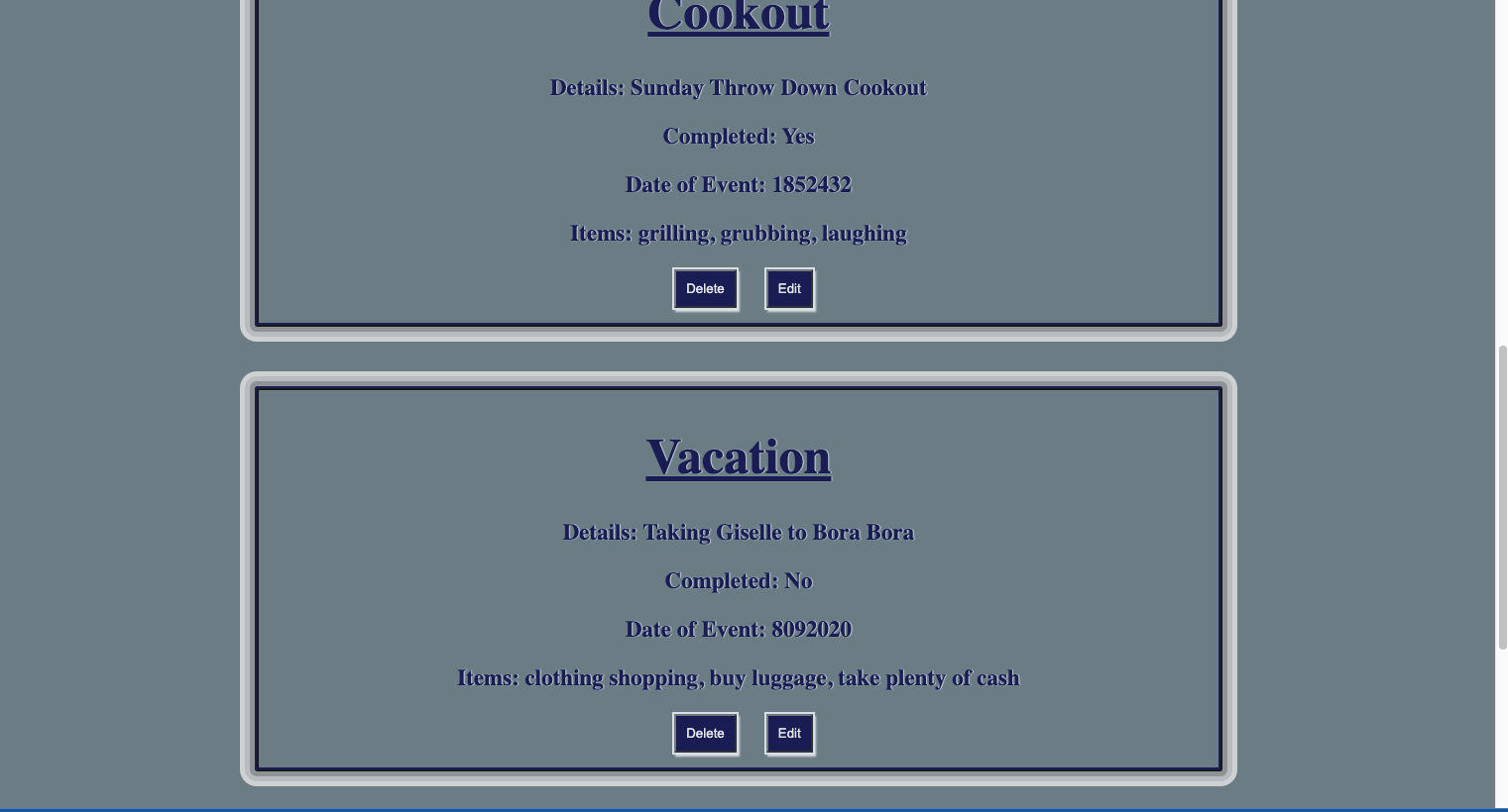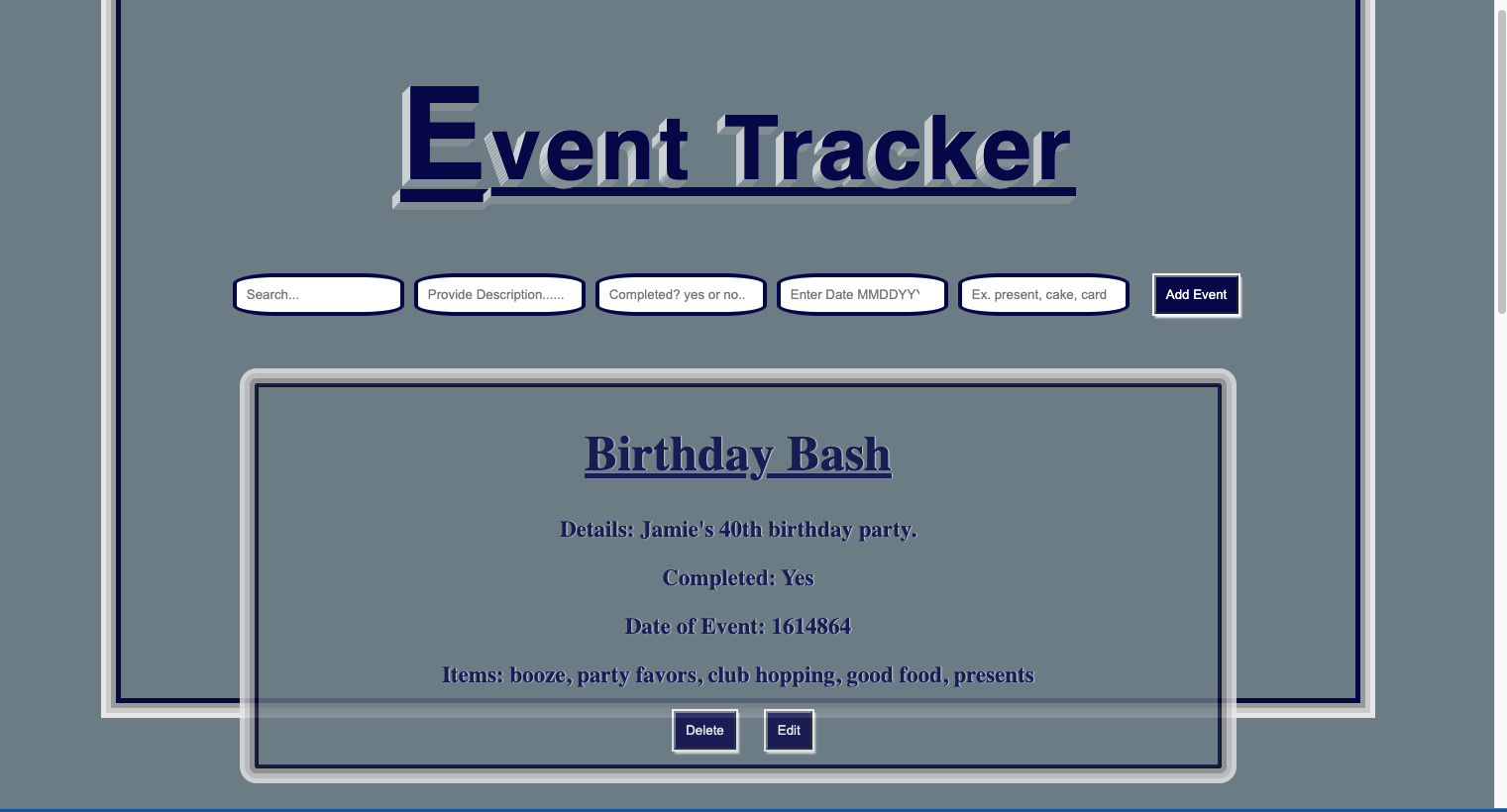 event-tracker Keep Track of all the Things you need to do for the week, Month. You can Edit and delete new items or old items.