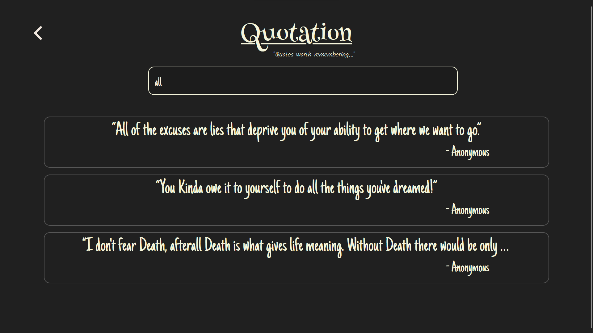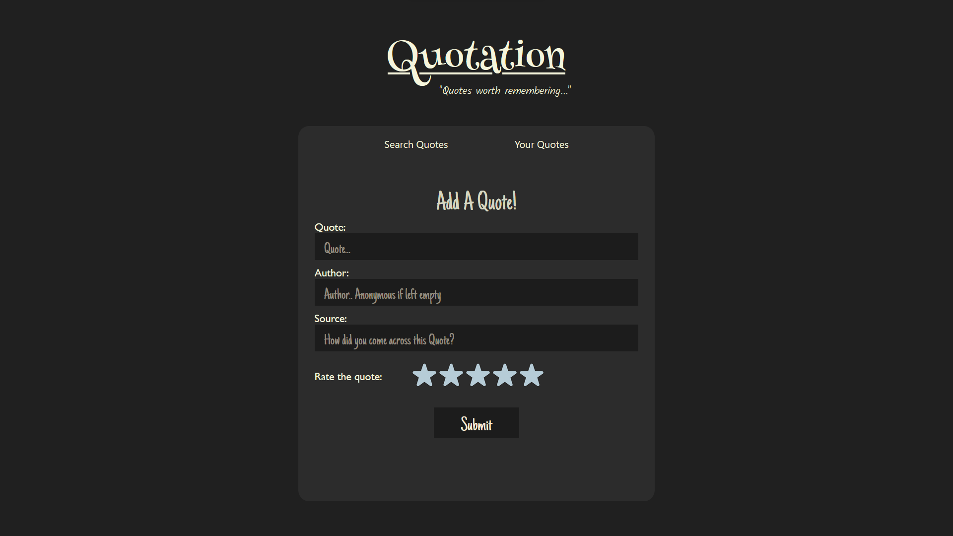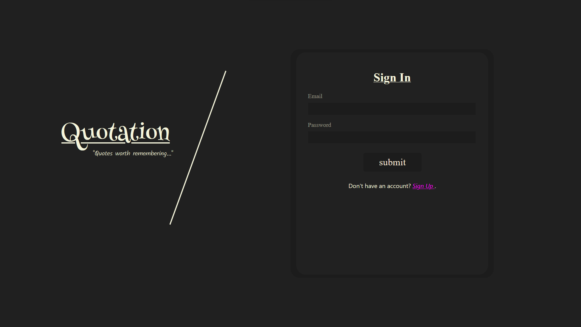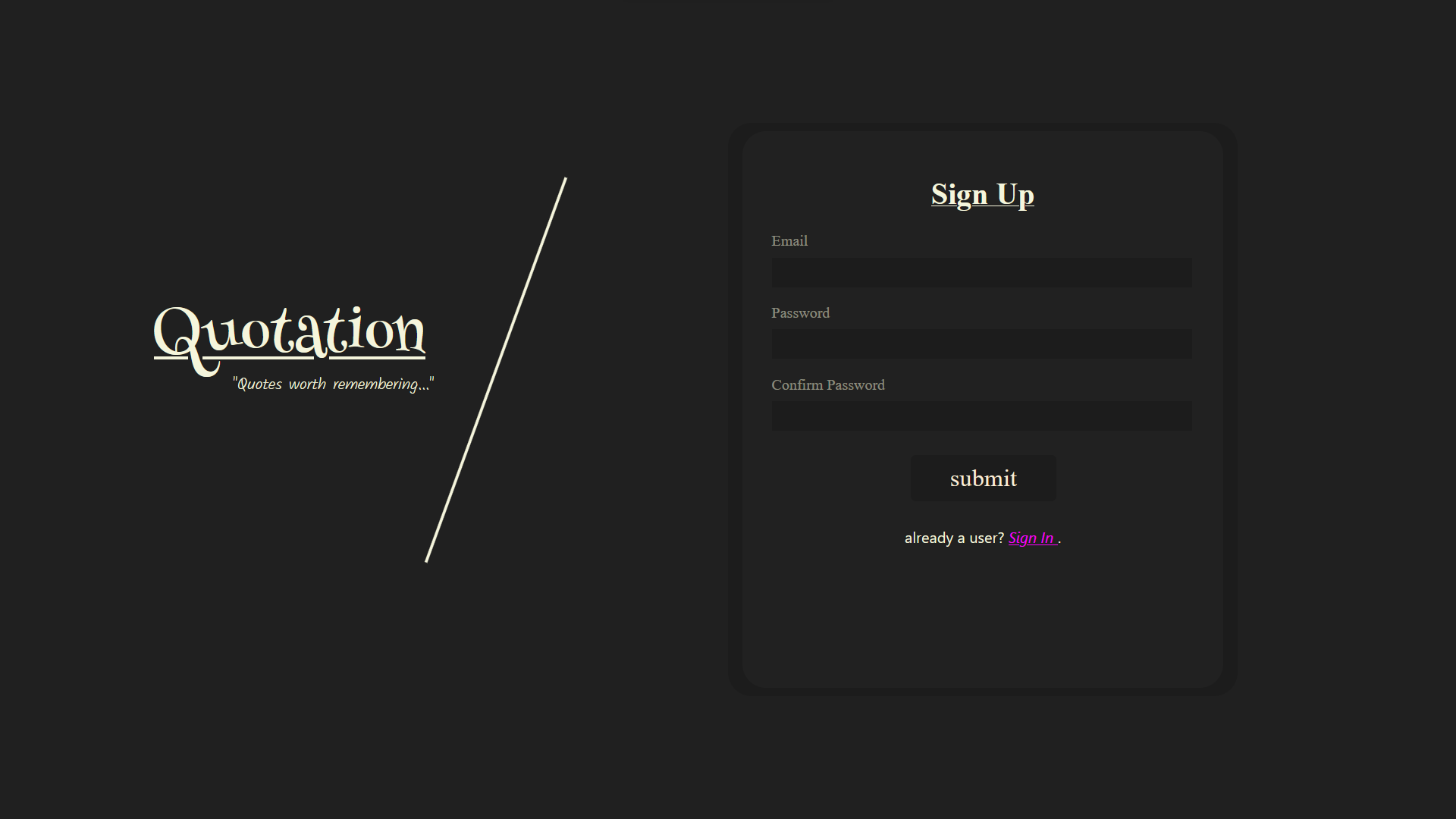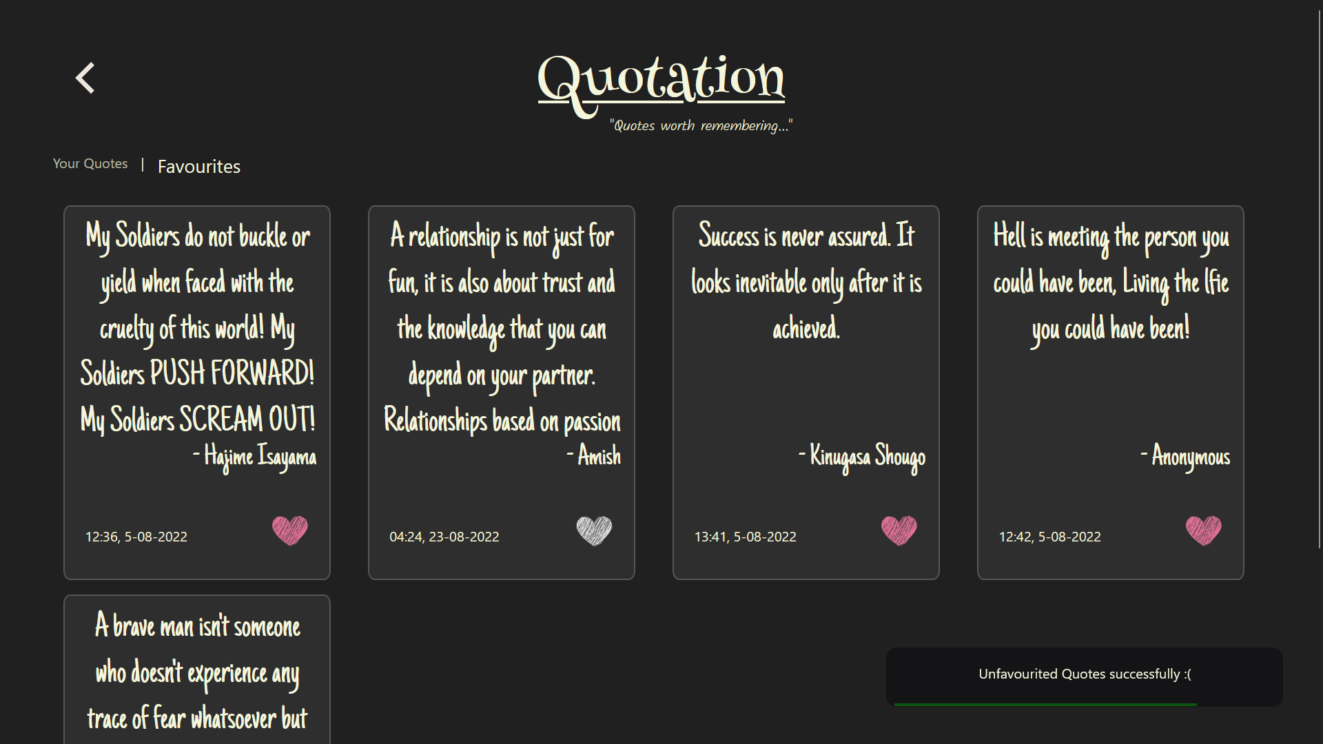 IMAGES: Login Page: Sign Up Page: Add a Quote Page: Your Quotes Page [Quotes uploaded by the user]: Favourite Quotes [ pop up notification when Quote is favourited or Unfavourited]: Search Quotes Page: Website Working Preview