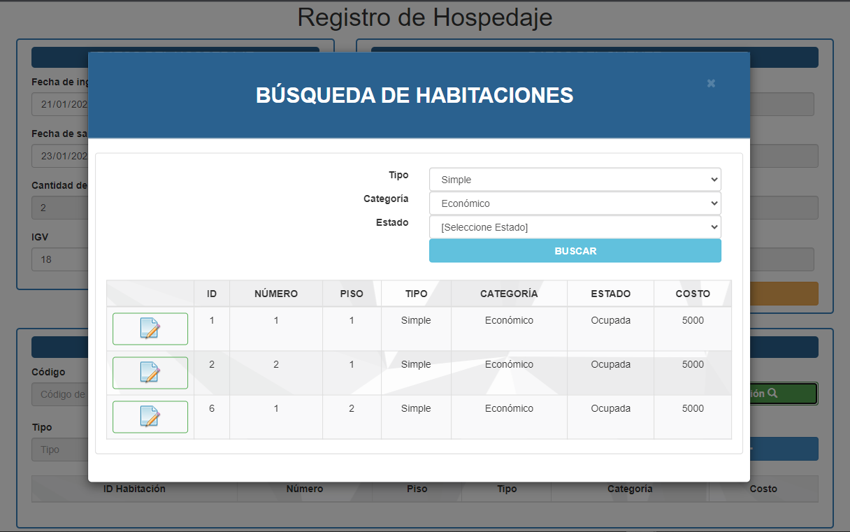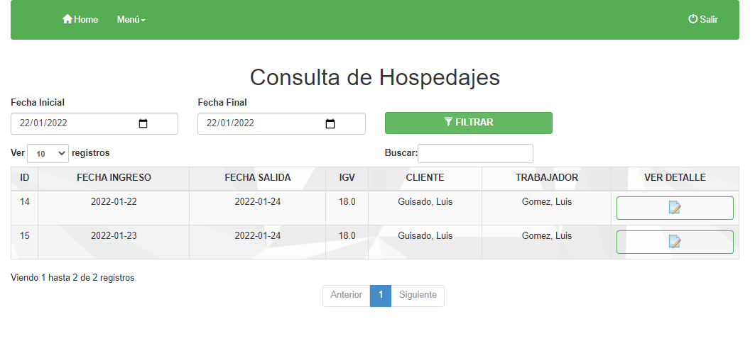 Este es el proyecto final presentado en el curso de Lenguaje de Programación II (2017) en Cibertec. Consiste en una aplicación web para la administración de hospedajes de un hotel. Ide Eclipse, Java JDK 8 (JSP, Servlet, JSTL, Lenguaje de Expresiones, JDBC, Patrón DAO, Sesiones Web, Aplicación de Transacciones). HTML5, CSS3, Javascript, JQuery, AJAX. Base de datos MySQL.