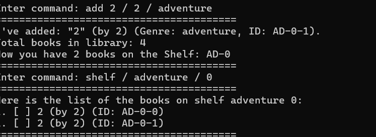 listcommand, it says that there is 1 book on the shelf (which is correct).As a result, the first added book is not visible through the 'list' command.