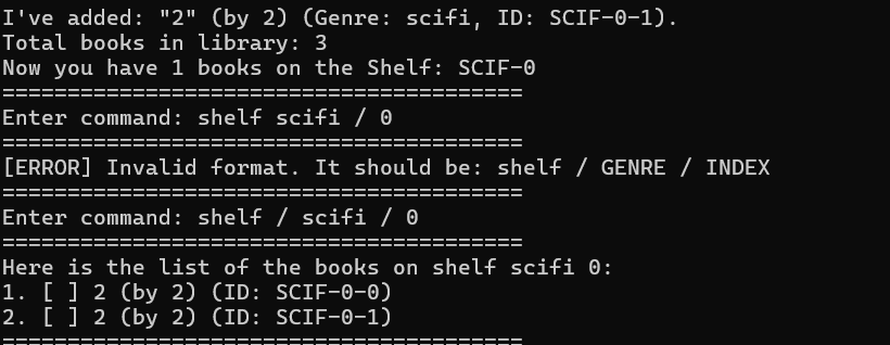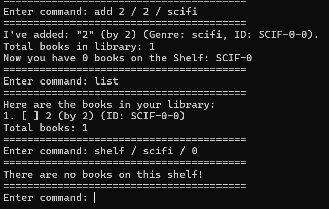 When adding a book with a scifi genre, it says book added, but there are 0 books on the shelf (which should be 1 as I have just added 1). Upon using the list command, it says that there is 1 book on the shelf (which is correct).