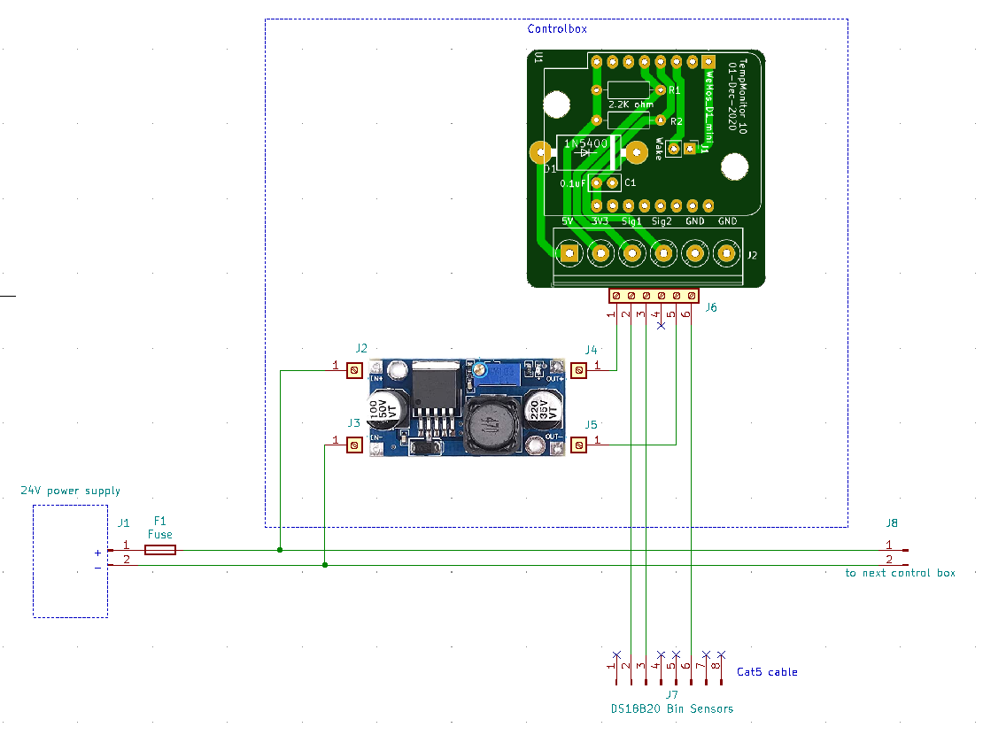 Temperature Monitor reads temperatures from DS18B20 sensors in grain bins. It consists of a server and multiple clients (controlboxes). The server is installed on a PC on the LAN. Each controlbox has a Wemos D1 Mini to send data over wifi to the server. It is designed to only allow one controlbox to send at a time to improve reliability of receiving the data. Another way to improve reliability is to use only short strings of sensors, one controlbox for every grain bin. The controlboxes are powered by 24V DC or solar.