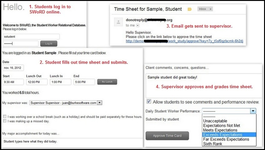 All submitted time sheets are stored on SWoRD to allow work study staff to keep track of approved or unapproved time sheets. Users with access to these stored time sheets are able to view each time sheet’s information including date, hours, student accomplishments, and supervisor comments.