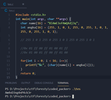 Dengan merubah hexadecimal tersebut dan mencari nilai asciinya maka didapatkan kode awal Kemudian kami menyalinnya kedalam fungsi mask_function pada C sehingga didapatkanlah flagnya.