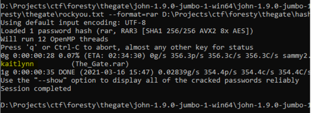 Diberikan file .rar yang terkunci, dengan menggunakan metode brute force pada tools john the ripper dan wordlist umum (rockyou) didapatkan passwordnya (kaitlynn).