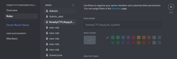 Diberikan link Join discord forestyCTF, masuk ke discord kemudian lihat pada bagian roles pada server setting roles sehingga terdapat flag