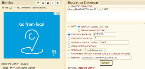 Diberikan clue untuk melakukan convert kode dari haxjslaKVJ{481750mtsm38kanwk93927} menjadi ROT 5 sehingga didapatkan mfcoxqfPAO{481750ryxr38pfsbp93927}. Dengan clue yang diberikan soal lakukan decode menggunakan beaufort cipher dengan kamus bahasa perancis sehingga didapatkan flagnya.