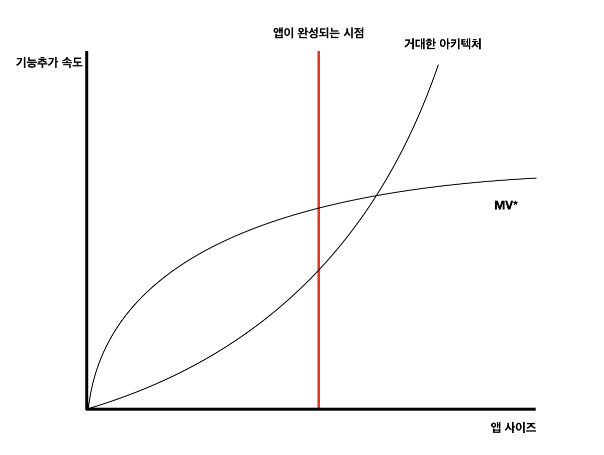 만들고자하는 앱에 가장 적절한 아키텍쳐를 설계하는 일이 무엇보다 중요하다고 생각합니다. 앱의 주요 로직, 서비스의 크기 등의 요소를 고려하여 최적화된 디자인 패턴을 적용하는 것이 개발의 속도, 리팩터링 등에 영향을 미치기 때문입니다. 그렇기 때문에 거대한 서비스에나 적용할만한 Viper, RIBs 등과 같은 구조는 제외했습니다. 적절한 디자인 패턴을 적용한다는 것의 의미는 무조건 더 어렵고 깔끔한 구조를 선택하는 것이 아니라, 경제성을 생각하여 기능 구현 및 리팩터링에 최적화된 구조를 선택하는 것입니다. 앱의 기획부터 제작까지 모든 과정에 참여하면서 우리가 만들고자하는 서비스는 정해진 기능을 모두 구현하면 추가적으로 구현할만한 기능은 없을 가능성이 매우 높고, 서비스의 크기 또한 크지 않았기 때문에 너무 거대한 아키텍처는 위 그림과 같이 오히려 개발 속도의 저하를 초래할 수 있다고 생각했습니다.