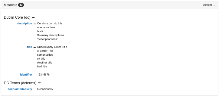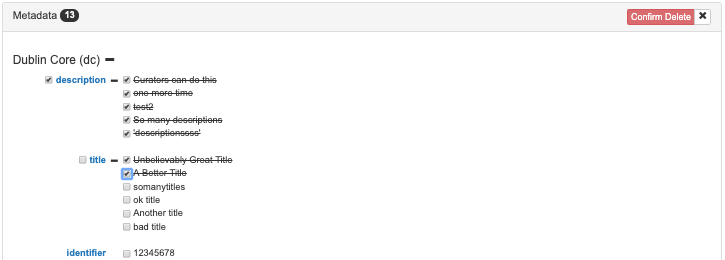 Metadata on a resource or container can be removed through the remove action found in the action dropdown at the top of the metadata section. Clicking this action will place the list of metadata in removal mode. In this mode checkboxes will appear beside each metadata value listed in the metadata section as well as all keys which have multiple values. Clicking on a value will queue that value for removal. Clicking on a checkbox beside a key will result in the queueing of all of its values for removal. Once values have been selected for removal, clicking the confirm button, found at the top of the metadata section, will result in the removal of a queued metadata.