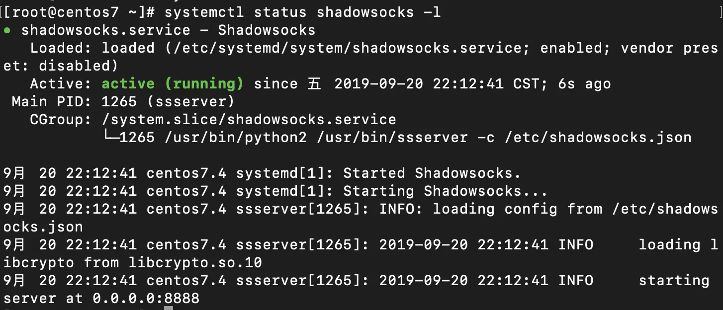 这如果显示active(running)就表示服务器配置成功。没有成功的话可以返回“安装配置shadowsocks”的第2步开始认真按介绍再来一次。