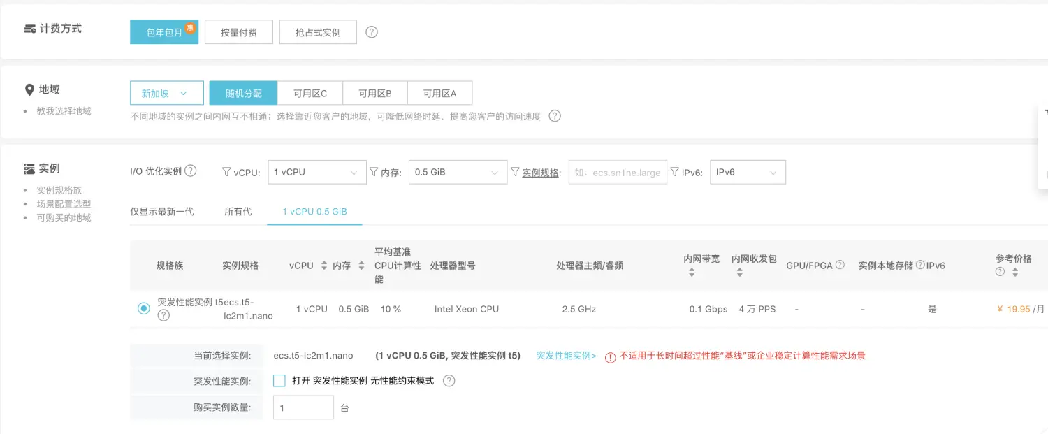 地域选择新加坡⬇️,实例选择最低配置即可。