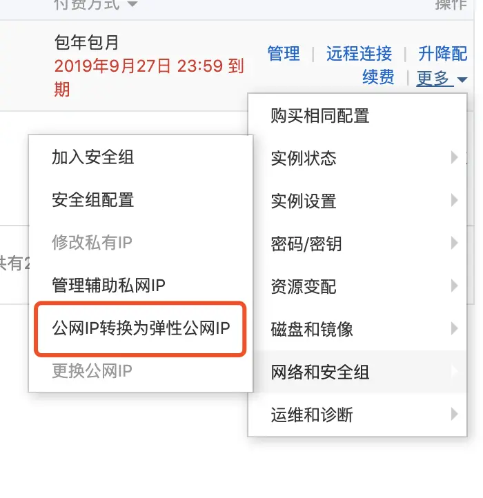 申请成功之后,先去ECS实例那里将公网IP转换为弹性公网IP