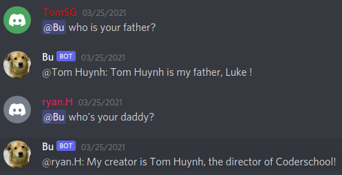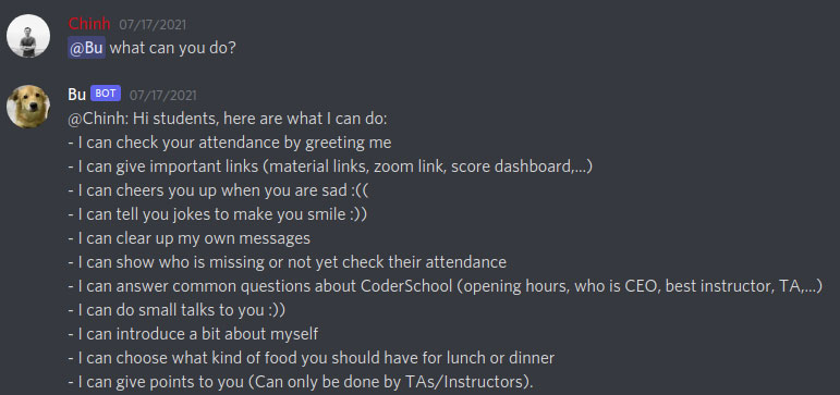 - Bu can answer common questions about CoderSchool (opening hours, who is CEO, best instructor, TA,...)